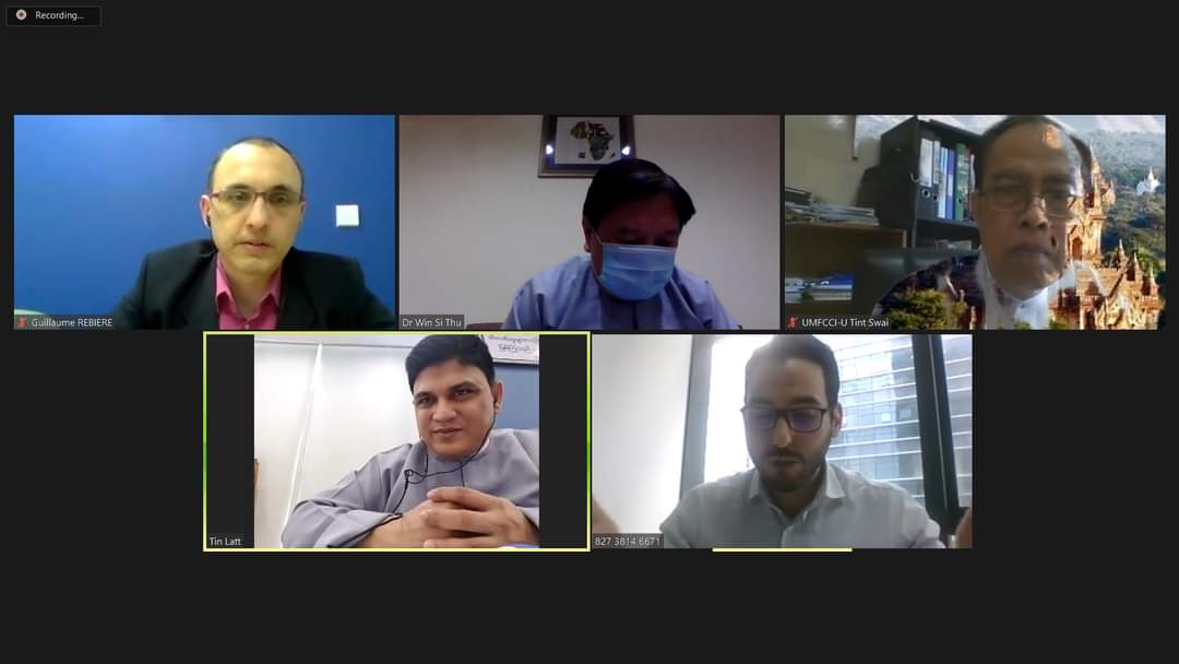 လမ်းမတော်မြို့နယ် UMFCCI တွင် သွင်းကုန်ပမာဏမြင့်တက်ခြင်းမှ တားဆီးကာကွယ်ခြင်း ဥပဒေတွင် ပါရှိသော ပြည်တွင်း ထုတ်လုပ်သူ၏ အဓိပ္ပာယ်ဖွင့်ဆိုချက်အား မြန်မာနိုင်ငံအခြေစိုက် ပြင်သစ် ကုန်သည်စက်မှုအသင်း Executive Director ဖြစ်သူ Mr. Guillaume REBIERE မှ ဆွေးနွေးမေးမြန်းလာခြင်းနှင့် စပ်လျဉ်း၍ Video Conferencing ဖြင့် ဆွေးနွေးပွဲအား ယမန်နေ့တွင် ကျင်းပခဲ့သည်။