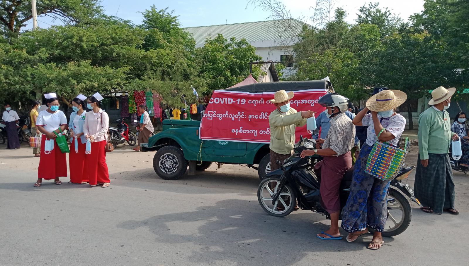 မြို့နယ် COVID-19ရောဂါကာကွယ်ထိန်းချုပ်ရေးအဖွဲ့မှ ဦးဆောင်လျက် လွှတ်တော်ကိုယ်စားလှယ်များ၊ မြို့နယ်စည်ပင် သာယာရေးအဖွဲ့၊ မြို့နယ်မီးသတ်တပ်ဖွဲ့၊ မြို့နယ်ရဲတပ်ဖွဲ့၊ မြို့နယ်ကျန်းမာရေးဦးစီးဌာန၊ မြို့နယ်အမျိုးသမီးရေးရာအဖွဲ့၊ မြို့နယ်အထွေထွေအုပ်ချုပ်ရေးဦးစီးဌာနနှင့် မြတ်သုခ လူမှုကူညီရေး အသင်းဝင်များက၊ ယင်းလမ်းမပေါ်တွင် သွားလာလျက်ရှိကြသည့် ပြည်သူများ၊ မော်တော်ယာဉ်၊ ဆိုင်ကယ်များဖြင့် မောင်းနှင်ဖြတ်သန်းသွားလာကြသူများအား နှာခေါင်းစည်း(mask) များ တပ်ဆင်ရန်ဝေငှပေးခြင်းနှင့် အပြင်ထွက်သွားလာတိုင်း နှာခေါင်းစည်း(mask) တပ်ဆင် သွားလာရေးတို့ အတွက် အသိပေးပြောကြားခြင်းများ စုပေါင်းဆောင်ရွက်ပေးခဲ့ကြကြောင်း သိရှိရသည်။