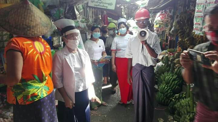 ထိုသို့ ပြုလုပ်ရာတွင် စျေးရောင်း၊စျေးဝယ် ပြည်သူများ နှာခေါင်းစည်း(Mask)များ မဖြစ်မနေ တပ်ဆင်ကြရန်၊ ကျန်းမာရေးနှင့်အားကစားဝန်ကြီးဌာနမှ ထုတ်ပြန်ထား သော ကျန်းမာရေး သတိပေးချက်များနှင့်အညီ တိတိကျကျ လိုက်နာရန်တို့ကို အသံချဲ့စက်ဖြင့်ဆော်ဩခြင်း၊ လက်ကမ်းစာစောင်များဝေငှခြင်း၊ နှာခေါင်းစည်း(Mask) များအခမဲ့ဖြန့်ဝေခြင်းများကို မြို့နယ်စည်ပင်သာယာ ရေးအဖွဲ့နှင့်အတူကျန်းမာရေးဌာနမှ တာဝန်ရှိသူများ၊ စျေးကော်မတီဝင်များက ပူးပေါင်းဆောင်ရွက်ခဲ့ကြောင်း သိရသည်။