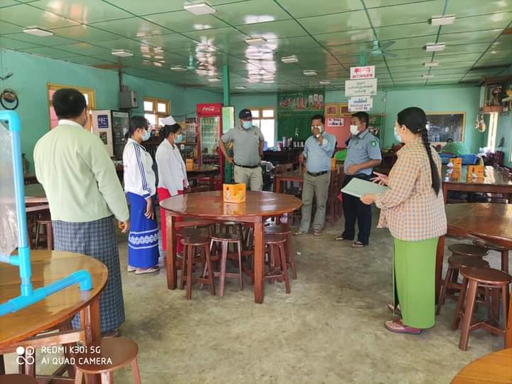 ကွင်းဆင်းစစ်ဆေးရာတွင် မြို့နယ် COVID-19 ရောဂါကာကွယ်၊ ကုသ၊ ထိန်းချုပ်ရေး ကော်မတီမှ ဦးမျိုးဇော်အောင်နှင့် အဖွဲ့ဝင်များ၊ မြို့နယ်စည်ပင်သာယာရေးဦးစီးဌာနမှ ဦးစည်သူဝင်း၊ ကျန်းမာရေးဦးစီးဌာန မှ တာဝန်ရှိသူများ က မြို့မဈေး နှင့် ရပ်ကွက်/ ကျေးရွာများရှိ စားသောက်ဆိုင်များအား COVID-19 ရောဂါ ကာကွယ်ရေးနည်းလမ်းများအတိုင်း ဆောင်ရွက်ထားခြင်းရှိ/မရှိစစ်ဆေးခြင်း၊ လိုအပ်သည့် ရောဂါ ကာကွယ် ရေး ပစ္စည်းများ ထားရှိစေခြင်း၊ လိုအပ်လာပါက အချိန်နှင့်တစ်ပြေးညီ ညှိနှိုင်းဆောင်ရွက်နိုင်ရန် ဆွေးနွေး ခြင်းများ ကို စားသောက်ဆိုင်ပိုင်ရှင် များအား တိုက်တွန်းပြောကြားခဲ့သည်။