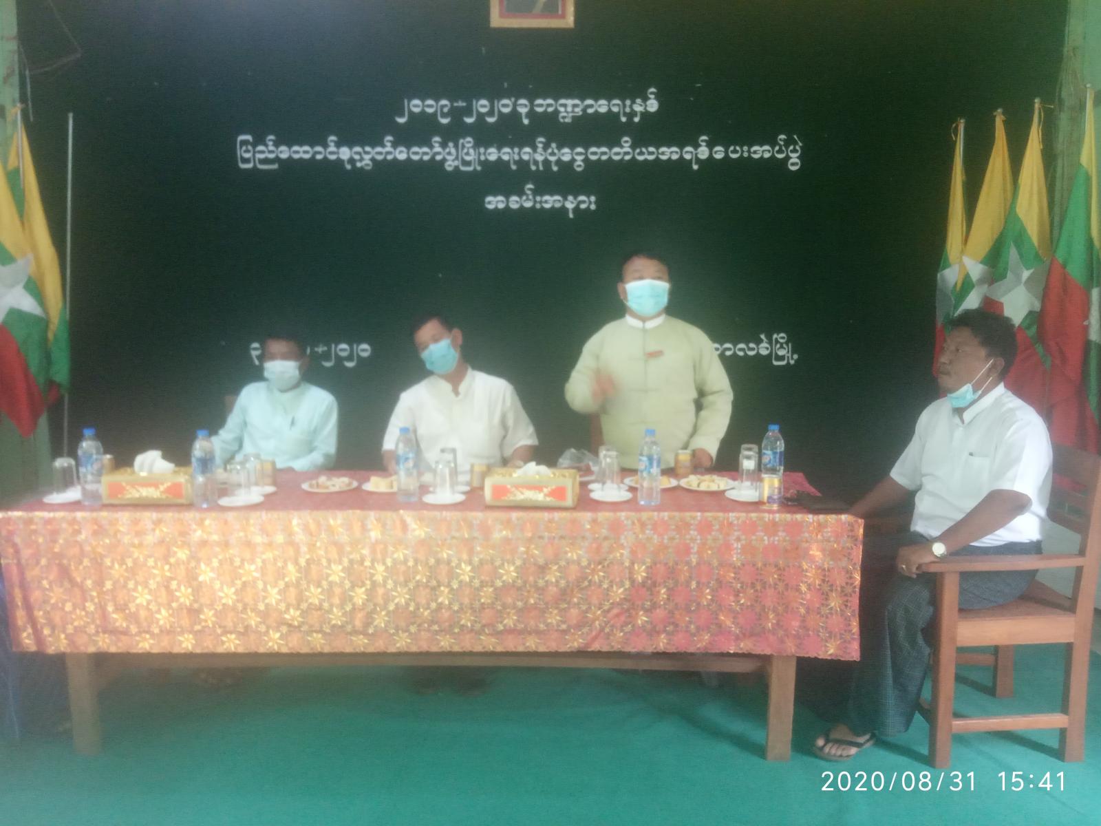 ဆက်လက်ပြီး မြို့နယ်ဖွံ့ဖြိုးရေးလုပ်ငန်း အကောင်အထည်ဖော်ရေးအဖွဲ့ဝင် အမျိုးသား လွှတ်တော်ကိုယ်စားလှယ် ဦးကျော်သန်း က လုပ်ငန်းနှင့်စပ်လျဉ်း၍ ရှင်းလင်းပြောကြားပြီး တာဝန်ရှိ သူများက ရပ်ကွက်/ကျေးရွာအုပ်ချုပ်ရေးမှူးနှင့် ရပ်/ကျေးစားရေးများထံ ၂၀၁၉-၂၀၂၀ ခုနှစ် ပြည်ထောင်စုလွှတ်တော် ခွင့်ပြုရန်ပုံငွေ ကျပ်သိန်း(၁၀၀၀)မှ နောက်ဆုံး အရစ် ပေးအပ်ခဲ့သည်။