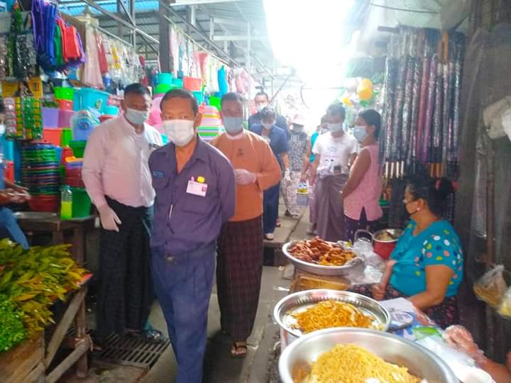 ကိုဗစ်-၁၉ ရောဂါ ကူးစက်ပျံ့နှံ့မှု မရှိစေရေးအတွက် အင်းစိန်မြို့နယ်၊ ပြည်သူ့လွှတ်တော် ကိုယ်စား လှယ် ဦးမောင်မောင် ဦး၊ စည်ပင်သာယာရေး ကော်မတီ ဥက္ကဌ ဦးသိန်းသန်းနှင့် တာဝန်ရှိသူ များသည် ယမန်နေ့ နံနက်(၇)နာရီအချိန်က ဈေးများ ဌာနမှ ခရိုင်ဦးစီးအရာရှိ ဌာနစုမှူး ဒေါ်ယဉ်ယဉ်စန်းနှင့် ဈေးတာဝန်ခံများနှင့်အတူ အောင်ဆန်းဈေးတွင် ကျန်းမာရေးနှင့် အားကစားဝန်ကြီးဌာနမှ ထုတ်ပြန်ထားသည့် လမ်းညွှန်ချက်များနှင့်အညီ ဈေးရောင်း၊ ဈေးဝယ်များ နှာခေါင်းစည်း များ တပ်ဆင်ထားခြင်း ရှိ/မရှိ ခြင်း၊ကိုဗစ်-၁၉ရောဂါ အသိပညာပေးခြင်းများ ဆောင်ရွက်ခြင်း၊ ဈေးဝယ်လာ သူများ နှာခေါင်းစည်းမပါလာပါက နှာခေါင်းစည်းတပ်ဆင်ပြီးမှ ဈေးအတွင်းသို့ ဝင်ရောက်စေခြင်းတို့ကို လိုက်လံ စစ်ဆေး ဆောင်ရွက်ခဲ့သည်။