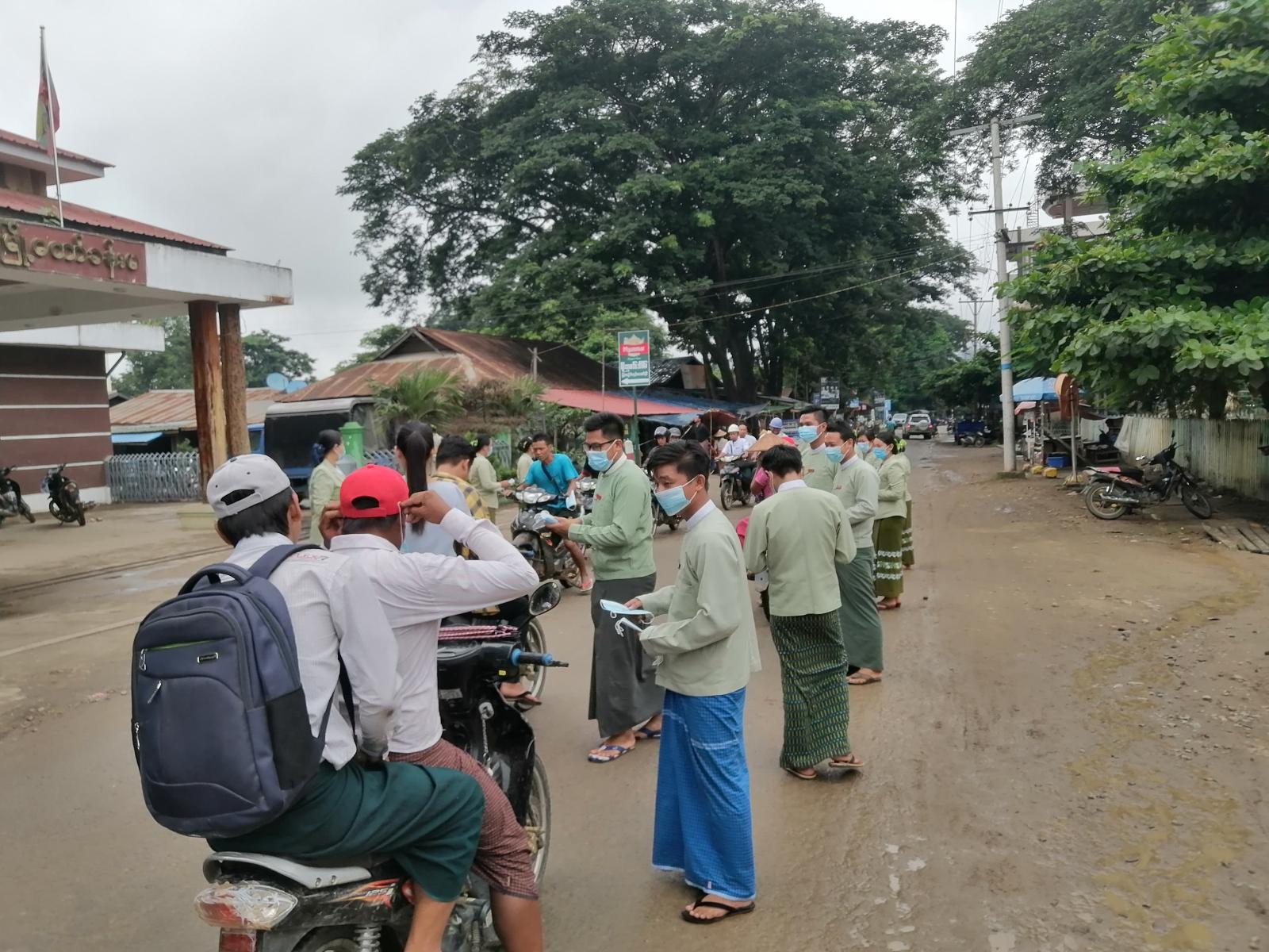အဆိုပါ ဗိုလ်ချုပ်လမ်းမကြီးတစ်လျှောက်နှင့် မြို့တော်ခန်းမလမ်းထောင့် တစ်လျှောက်တို့တွင် ဖြတ်သန်းသွား လာနေသည့် မော်တော်ယာဉ်များ၌ နှာခေါင်းစည်းတပ်ဆင်မှု မရှိသည့် ပြည်သူများအား နှာခေါင်းစည်းများ (၅၀၀)ခု အခမဲ့ဖြန့်ဝေပေးခြင်းဖြင့် အသိပညာပေး လုပ်ငန်း များကို ဆောင်ရွက်လျက်ရှိကြောင်း၊ အပြင်သွား လျှင် စနစ်တကျ နှာခေါင်းစည်း တပ်ဆင်အသုံးပြုစေရေး အသိပညာပေးလုပ်ငန်းများကို ဗန်းမောက်မြို့နယ် အထွေထွေ အုပ်ချုပ်ရေးဦးစီးဌာန မြို့နယ်အုပ်ချုပ်ရေးမှူး ဦးအေးမင်း၏ ပံ့ပိုးမှုဖြင့် ဒုတိယဦးစီးမှူး ဒေါ်နွယ်နွယ်ဝင်းနှင့် ဝန်ထမ်းများက ကိုဗစ်-၁၉ ရောဂါ ကာကွယ်ထိန်းချုပ်နိုင်ရေး အသိပညာပေးလုပ်ငန်း များကို အရှိန်အဟုန်မြှင့် ဆောင်ရွက်ပေးခြင်း ဖြစ်ကြောင်း သိရသည်။