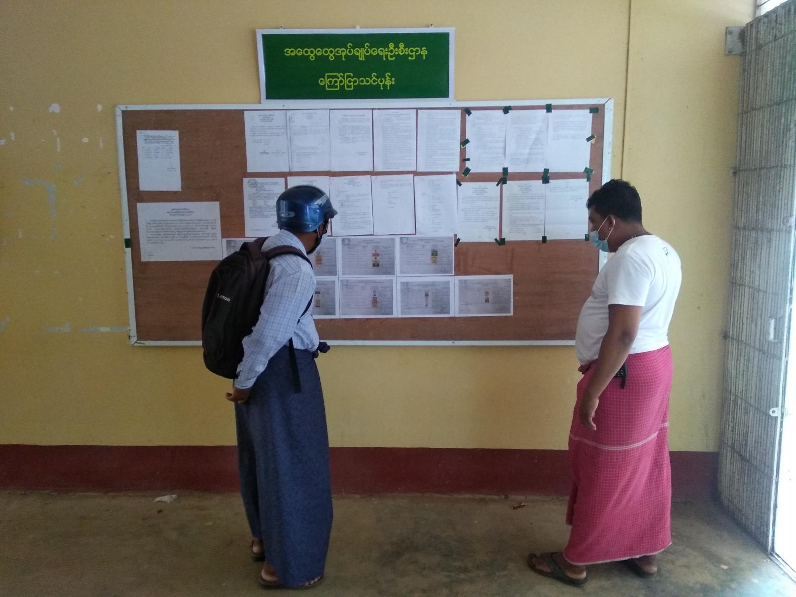 ပါဝင်အရွေးခံကြမည့် လွှတ်အသီးသီး၏ ကိုယ်စားလှယ်လောင်းအမည်များကို မြို့နယ် ကော်မရှင်အဖွဲ့ခွဲရုံးနှင့် ရပ်ကွက်/ကျေးရွာကော်မရှင်အဖွဲ့ခွဲရုံးများတွင်လည်း ကပ်ထားသည်။ ပုသိမ် မြိုနယ်တွင် ရပ်ကွက် ၂၅၊ ကျေးရွာအုပ်စု ၅၃၊ မဲရုံ ၂၀၀ ရှိကြောင်းသိရသည်။