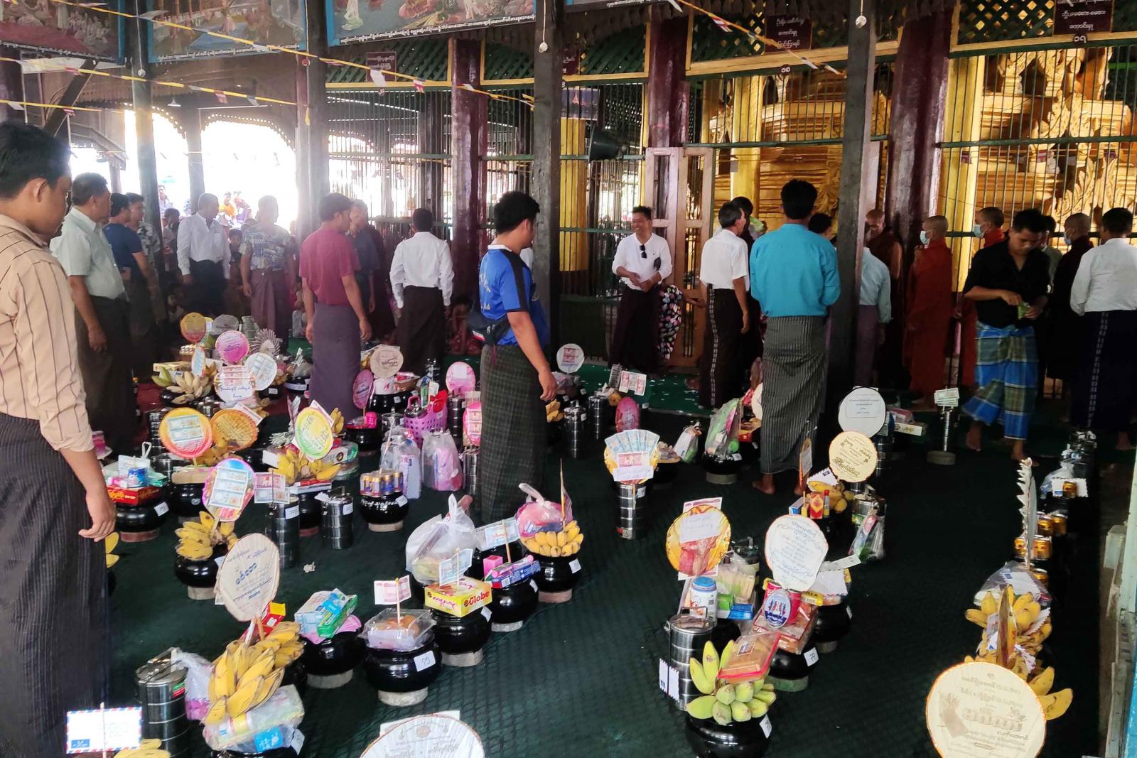 “ကျွန်တော်တို့ ရွှေဘုံသာ ဘုန်းကြီးကျောင်းမှာ သံဃာဒါနဆွမ်းသပိတ်လုံး လောင်းလှူပွဲကို မြင်းခြံမြို့ပေါ် ရပ်ကွက် အသီးသီးမှာရှိတဲ့ ဆရာတော်၊ သံဃာတော်များအား ပင့်ဖိတ်ပြီး ဆွမ်းသပိတ်လုံး ကပ်လှူပူဇော်ခြင်း ဖြစ်ပါတယ်။ လောင်းလှူတဲ့ နေရာမှာလည်း မြင်းခြံမြို့ အမှတ်(၂) ရပ်ကွက်မှာ မှီတင်းနေထိုင်ကြတဲ့ စေတနာရှင် အလှူရှင်များအပြင် အခြား အလှူရှင် များမှလည်း ဆွမ်းသပိတ်လုံးများ လာရောက် လှူဒါန်းကြပါတယ်။ ကျွန်တော်တို့ ရပ်ကွက် ဆွမ်းသပိတ်လုံး လောင်းလှူပွဲဟာ တစ်နှစ်လျှင် (၂) ကြိမ် ကျင်းပပါတယ်”ဟု ရွှေဘုံသာ မြတ်စွာဘုရား ဂေါပက အဖွဲ့ဝင်တစ်ဦးက ပြောသည်။