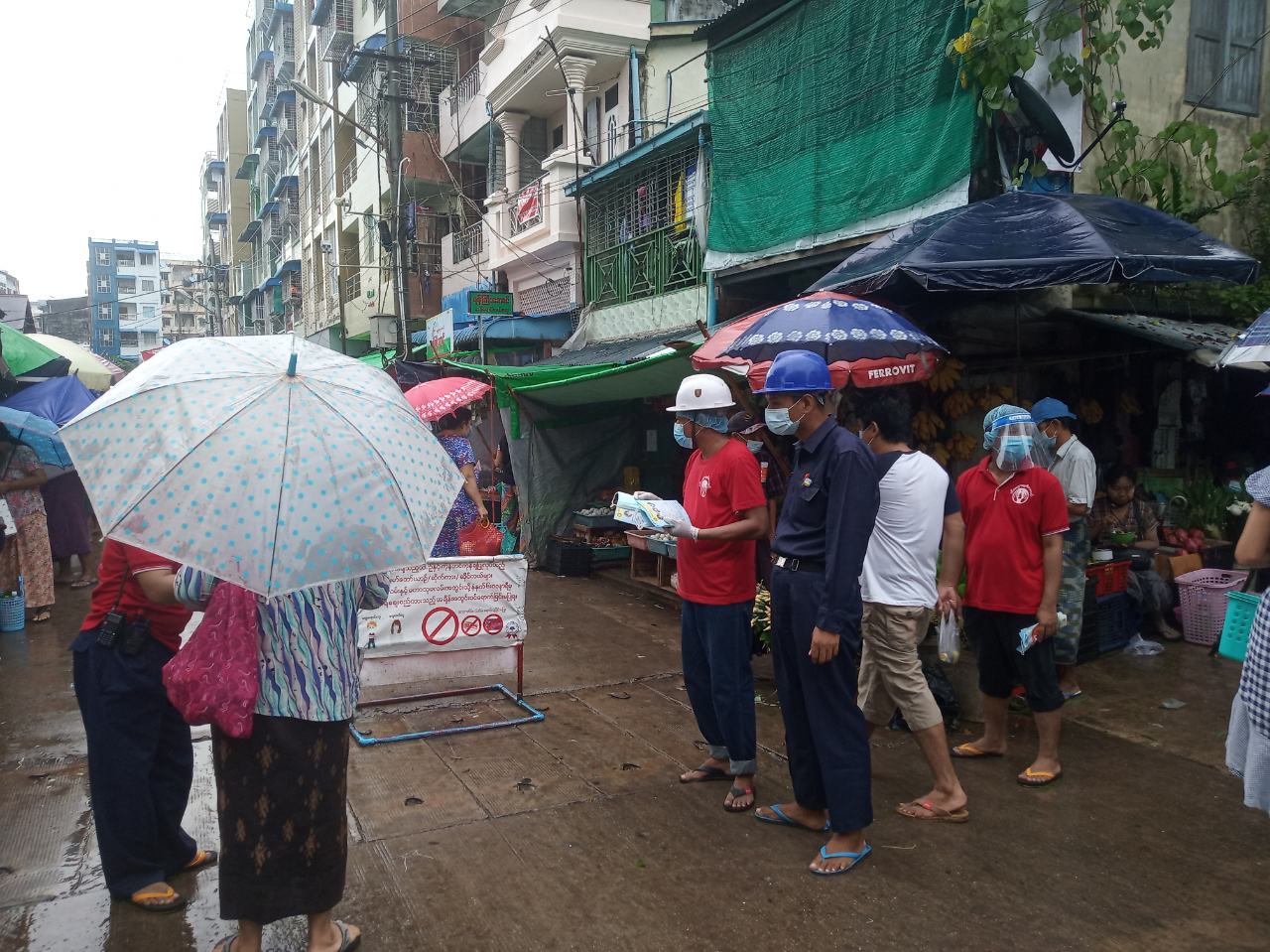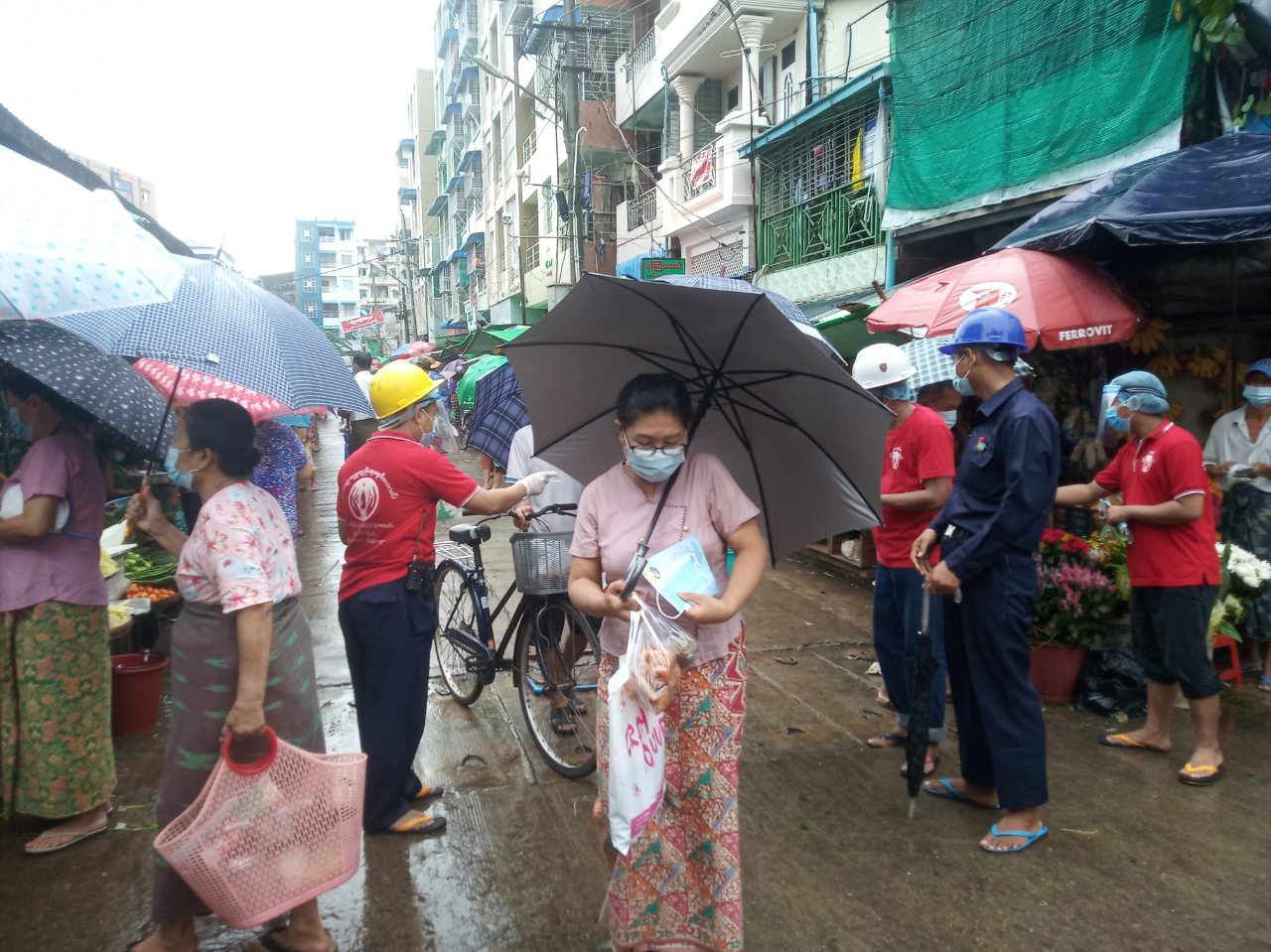 ရန်ကုန်အနောက်ပိုင်းခရိုင်၊ စမ်းချောင်းမြို့နယ်၊ လင်းမြောက်ရပ်ကွက်၊ မြသီတာလမ်း ယာယီပျံကျစျေးအတွင်း ယနေ့နံနက် ၈ နာရီခန့်က ကိုဗစ်-၁၉ ရောဂါကြိုတင် ကာကွယ်နိုင်ရန် အတွက် စျေးရောင်းသူနှင့် စျေးဝယ်သူများကို နှာခေါင်းစည်း (mask) များ အခမဲ့ဖြန့်ဝေပေးခဲ့သည်။
