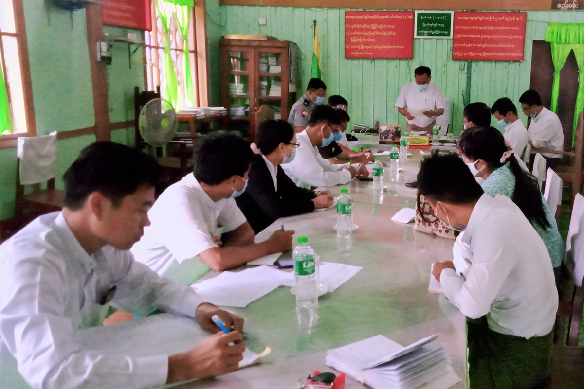 ယင်းနောက် မြို့နယ်အဆင့်ကိုဗစ်−၁၉ရောဂါ ထိန်းချုပ်ရေးနှင့် အရေးပေါ်တုံ့ပြန်ရေး ကော်မတီဝင်များက မြို့နယ်အတွင်း ကိုဗစ်-၁၉ရောဂါ ကာကွယ် ထိန်းချုပ်နိုင်ရေးအတွက် သက်ဆိုင်ရာ ကအလိုက်ဆောင်ရွက်မည့် အခြေအနေများကို အကြံပြုဆွေးနွေးတင်ပြခဲ့ရာ မြို့နယ်အုပ်ချုပ်ရေးမှူးက လိုအပ်သည်များကို ပေါင်းစပ်ညှိနှိုင်း ဆောင်ရွက်ကြရန် ဆွေးနွေး ပြောကြားခဲ့ကြောင်း သိရှိရသည်။