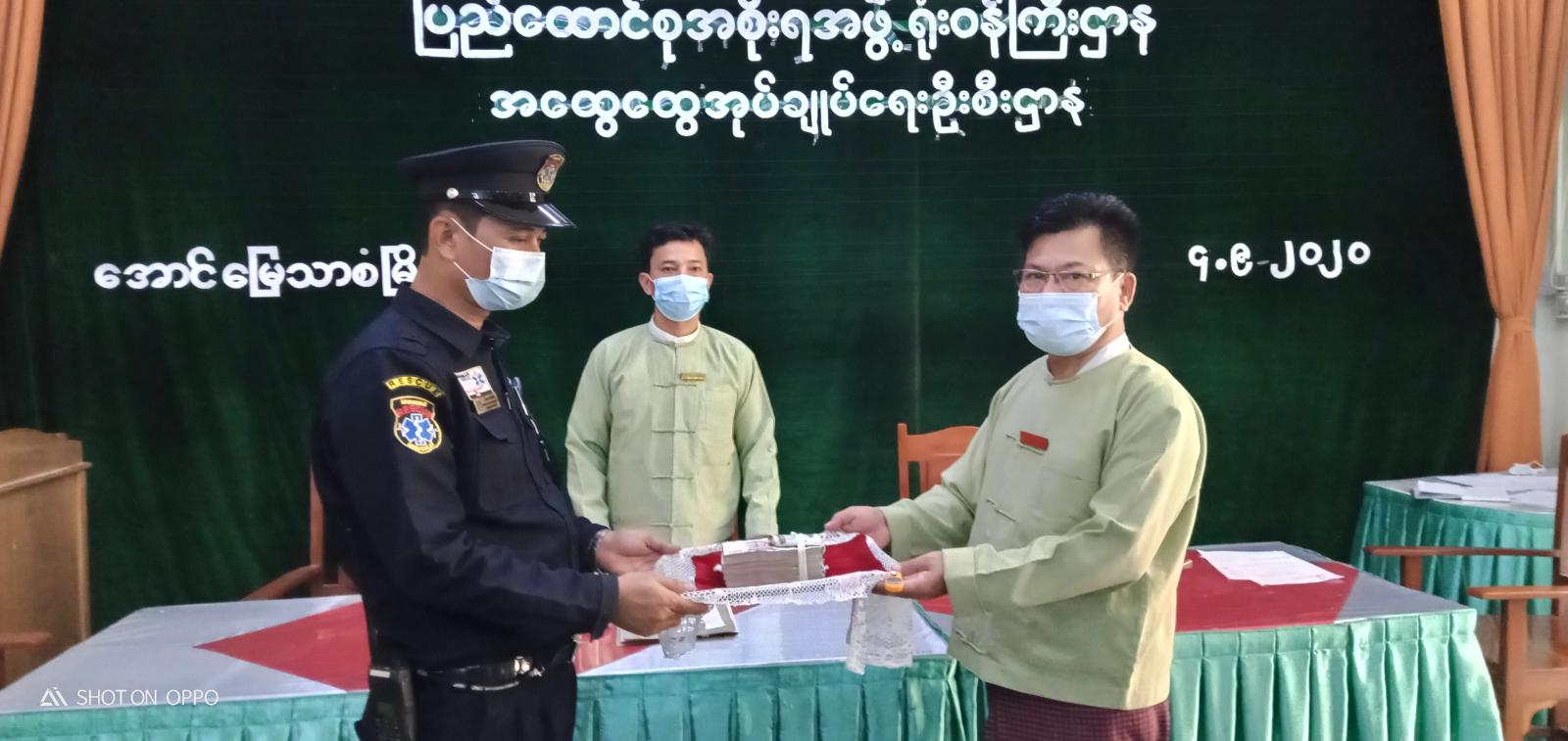 ထို့နောက် မြို့နယ်အုပ်ချုပ်ရေးမှူးနှင့် မန္တလေးလူငယ်သင်တန်းကျောင်းအုပ်ကြီးတို့က စေတနာ့ဝန်ထမ်းပံ့ပိုးကူညီရေးအသင်းအဖွဲ့ တစ်ဖွဲ့လျှင် ၁၅ ရက်စာ သယ်ယူပို့ဆောင်စရိတ် ထောက်ပံ့ငွေ ၆၇၅၀၀ ကျပ်နှုန်းဖြင့် စုစုပေါင်း ၂၀၂၅၀၀၀ ကျပ်အား စေတနာ့ဝန်ထမ်း ပံ့ပိုးကူညီရေးအသင်းအဖွဲ့ (၃၀) ကိုပေးအပ်ရာ ပရဟိတမင်းခေါင်ရှာဖွေကယ်ဆယ်ရေးအဖွဲ့မှ ဥက္ကဋ္ဌ ဦးခင်မောင်တင့်နှင့် နန်းတော်ရှေ့လူမှုကယ်ဆယ်ရေးအသင်းမှဥက္ကဋ္ဌ ဦးသိန်းထွန်းအောင်တို့က အသင်းအဖွဲ့များကိုယ်စားလက်ခံရယူကြသည်။