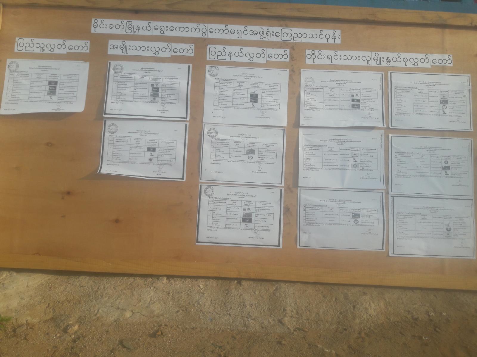 အဆိုပါ လွှတ်တော်ကိုယ်စားလှယ်လောင်းများ၏ အမည်စာရင်းများကို သြဂုတ်လ ၃၀ ရက်နေ့မှစ၍ ရပ်ကွက်/ကျေးရွာ၊ အုပ်စုများ အထိ ကပ်ထားကြေငြာခဲ့ရာ ဒေသခံမဲဆန္ဒရှင် ပြည်သူများက လာရောက်လေ့လာ ကြည့်ရှုလျက်ရှိကြောင်း မြို့နယ်ရွေးကောက်ပွဲ ကော်မရှင် အဖွဲ့ခွဲရုံးမှ သိရသည်။