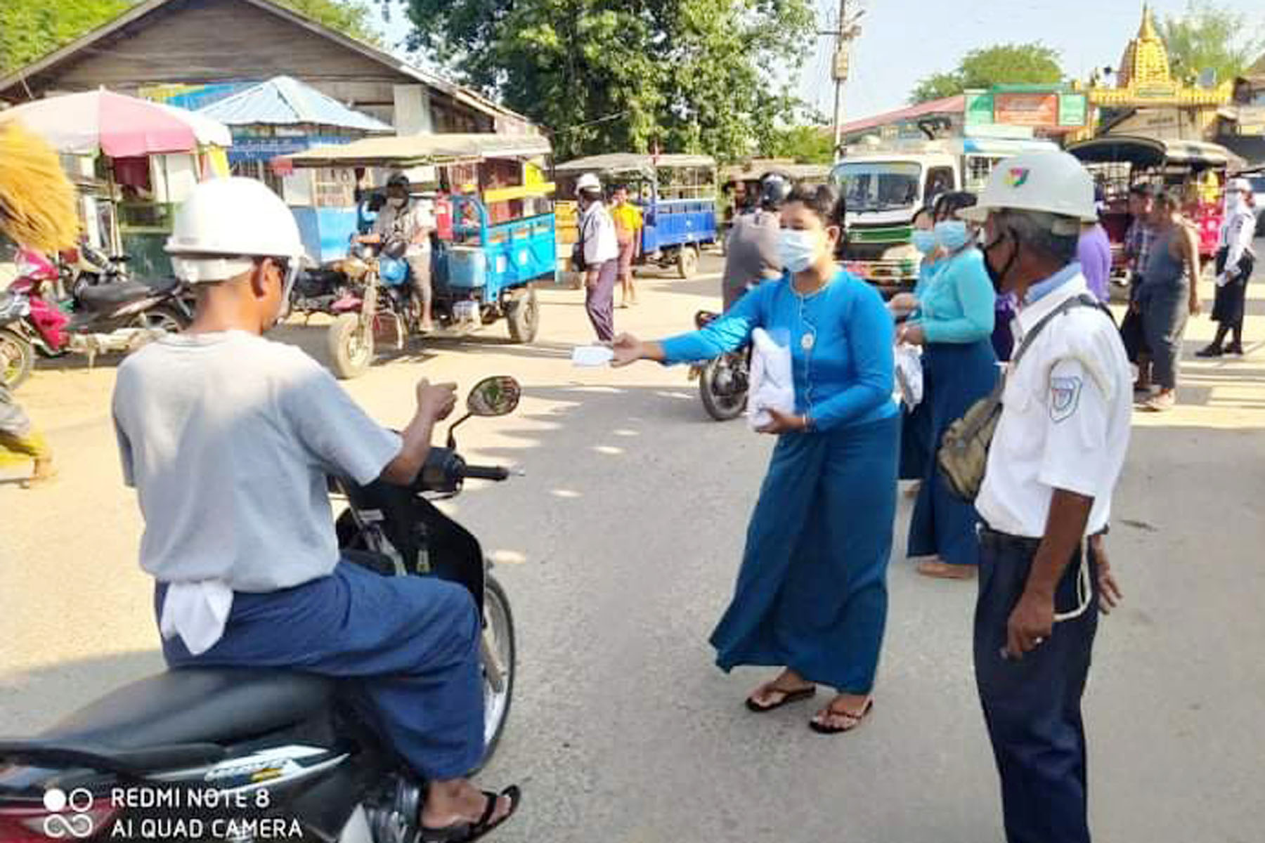 ကိုဗစ်-၁၉ ရောဂါကြိုတင်ကာကွယ်ရန်အတွက် မြို့နယ်အတွင်းရှိ ပြည်သူများအနေဖြင့် လူစုလူဝေးနေရာများ ရှောင်ကျဉ်ရန်နှင့် နေအိမ်ပြင်ပထွက်ခွာသွားလာသူတိုင်း မဖြစ်မနေနှာခေါင်းစည်းတပ်ဆင်သွားလာသည့် အလေ့အကျင့် ရရှိစေရန် အသိပညာပေးအနေဖြင့် နှာခေါင်းစည်းများ အခမဲ့ဖြန့်ဝေပေးခြင်းဖြစ်ကြောင်း မြို့နယ် အမျိုးသမီးရေးရာအဖွဲ့ဥက္ကဋ္ဌထံမှ သိရသည်။