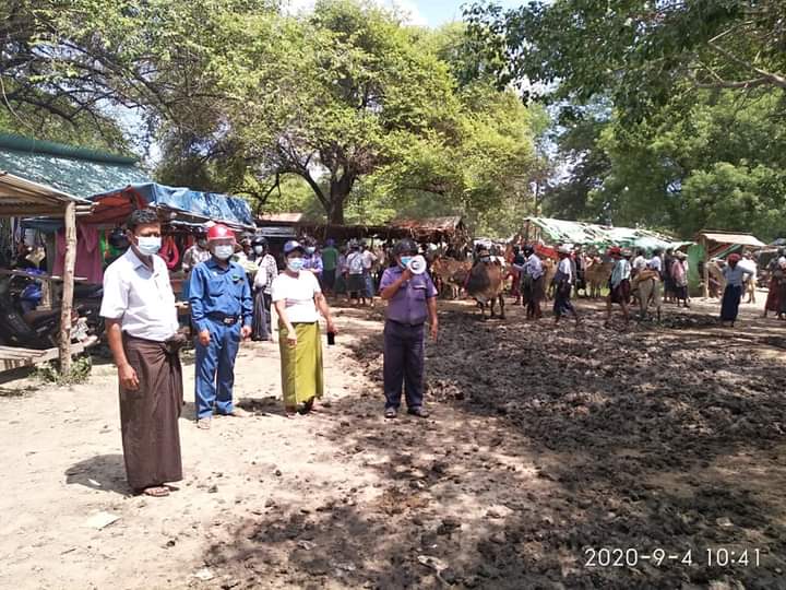 ထိုသို့ ဆောင်ရွက်ရာတွင် နွားအရောင်းအဝယ်ပြုလုပ်ကြသော ပြည်သူများ ကိုဗစ်-၁၉ ကူးစက်ရောဂါမဖြစ်ပွား စေရေးအတွက် ကျန်းမာရေးနှင့်အားကစားဝန်ကြီးဌာနမှ ထုတ်ပြန်ထားသော ကျန်းမာရေးဆိုင်ရာ လမ်းညွန်ချက်များ၊ သတိပေးနှိုးဆော်ချက်များကို လိုက်နာကြရန်၊ အရောင်းအဝယ်ပြုလုပ်ကြသော ပြည်သူများ အနေဖြင့် တစ်ဦးနှင့်တစ်ဦး တတ်နိုင်သမျှခပ်ခွါခွါမှ နေထိုင်ပြောဆိုဆက်ဆံကြပါရန်၊ လူစုလူဝေးမပြုလုပ်ကြပါ ရန်နှင့် နှာခေါင်းစည်း(Mask)များစနစ်တကျတပ်ဆင်ကြရန်တို့ကို (Hand Speaker)ဖြင့် လှည့်လည်ကြေညာခဲ့ ကြသည်။