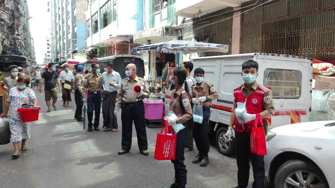 ထိုသို့ဆောင်ရွက်ရာတွင် မြို့နယ်ကြက်ခြေနီသူနာပြု တပ်ဖွဲ့မှ မြို့နယ်တပ်ဖွဲ့မှူး ဦးဝဏ္ဏရှိန်၊ ဒုတိယမြို့နယ်တပ်ဖွဲ့မှူး ဦးပြည်စိုးနှင့် မြို့နယ်ကြက်ခြေနီသူနာပြုတပ်ဖွဲ့ဝင်များက နှာခေါင်းစည်း မတပ်ဆင်သူများအား အသိပညာပေးခြင်းနှင့် နှာခေါင်းစည်း လိုအပ်သူများအား နှာခေါင်းစည်းများ ဝေငှပေးခြင်း၊ အပြင်ထွက်သည့်အခါ စျေးရောင်း စျေးဝယ်ပြုလုပ်သည့်အခါတိုင်း နှာခေါင်း စည်း တပ်ဆင်ကြရန်၊ လူစုလူဝေးနေရာများကို မလိုအပ်ဘဲ သွားလာခြင်းမပြုရန် စသည်တို့ကိုလည်း Hand Speaker များနှင့် ပြည်သူများ သိရှိနိုင်စေရန်အတွက် ကြေညာပေးခြင်းများ ဆောင်ရွက်ခဲ့ ကြောင်း သိရသည်။