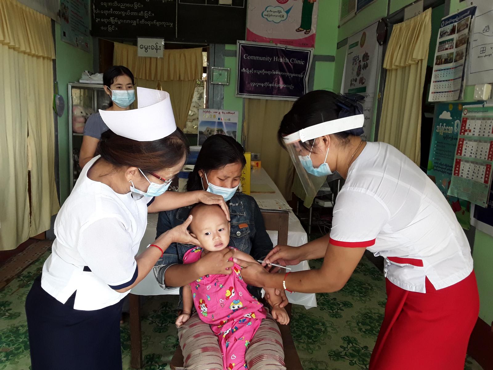 ပုံမှန်ကာကွယ်ဆေးထိုးနှံတိုက်ကျွေးရန် လာရောက်သည့် မိခင်နှင့်ကလေးများအား ကိုဗစ်-၁၉ ကြိုတင်ကာကွယ်ရေးအတွက် ကျန်းမာရေးနှင့်အားကစားဝန်ကြီးဌာနမှ ထုတ်ပြန်ထားသည့် စည်းကမ်းချက်များနှင့် လက်ကိုစနစ်တကျဆေးကြောစေရန် လက်ဆေး ဘေစင်များထားရှိခြင်း၊ Hand gel အသုံးပြုစေခြင်း၊ နှာခေါင်းစည်း MASK များ စနစ်တကျ တပ်ဆင်စေခြင်းနှင့် လူစုလူဝေး မဖြစ်စေရေး (၅)ဦး တစ်ကြိမ် စနစ်တကျ ထိုးနှံတိုက်ကျွေးပေးလျက်ရှိကြောင်း သိရသည်။