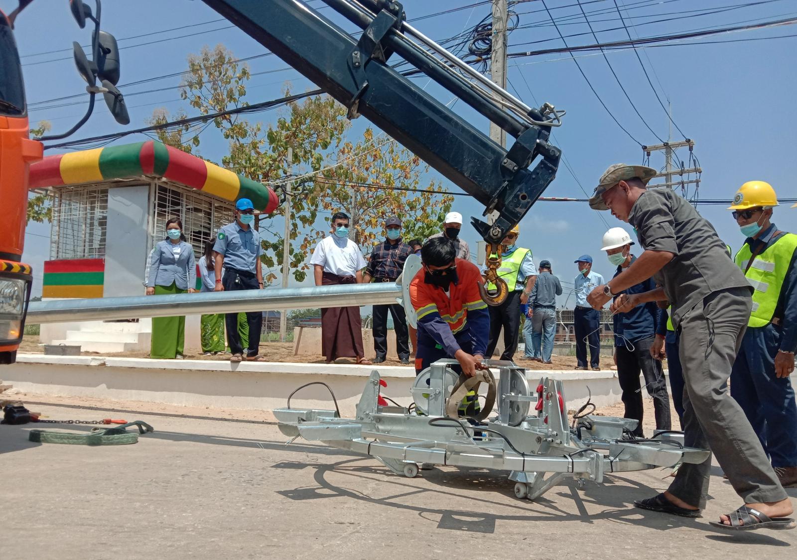 Free Way လမ်းဖော်ဆောင်ရာ၌ လမ်းသားတိုးချဲ့ ကွန်ကရစ်ခင်းခြင်းဆောင်ရွက်ခဲ့ရာ လမ်းနယ်အတွင်း ရောက်ရှိနေသော လျှပ်စစ်ဓာတ်တိုင် များနှင့် ဓာတ်ကြိုးများ ဖြုတ်သိမ်း၍ လမ်းနယ်နှင့်လွတ်ကင်းသောနေရာတွင် လျှပ်စစ်ဓာတ်တိုင်သစ်စိုက်ထူပြီး လျှပ်စစ်ဓာတ်ကြိုးများကို စနစ်တကျ ပြန်လည် တပ်ဆင်ပေးလျက်ရှိသည်။