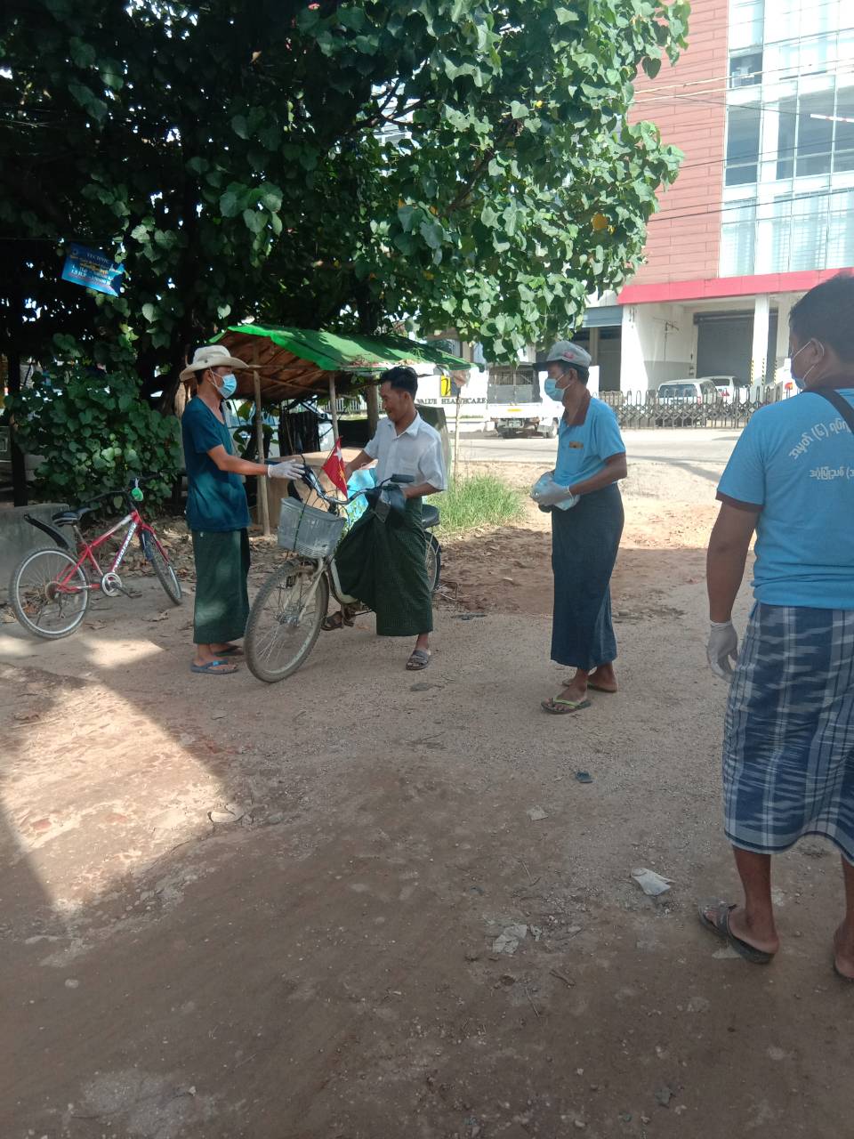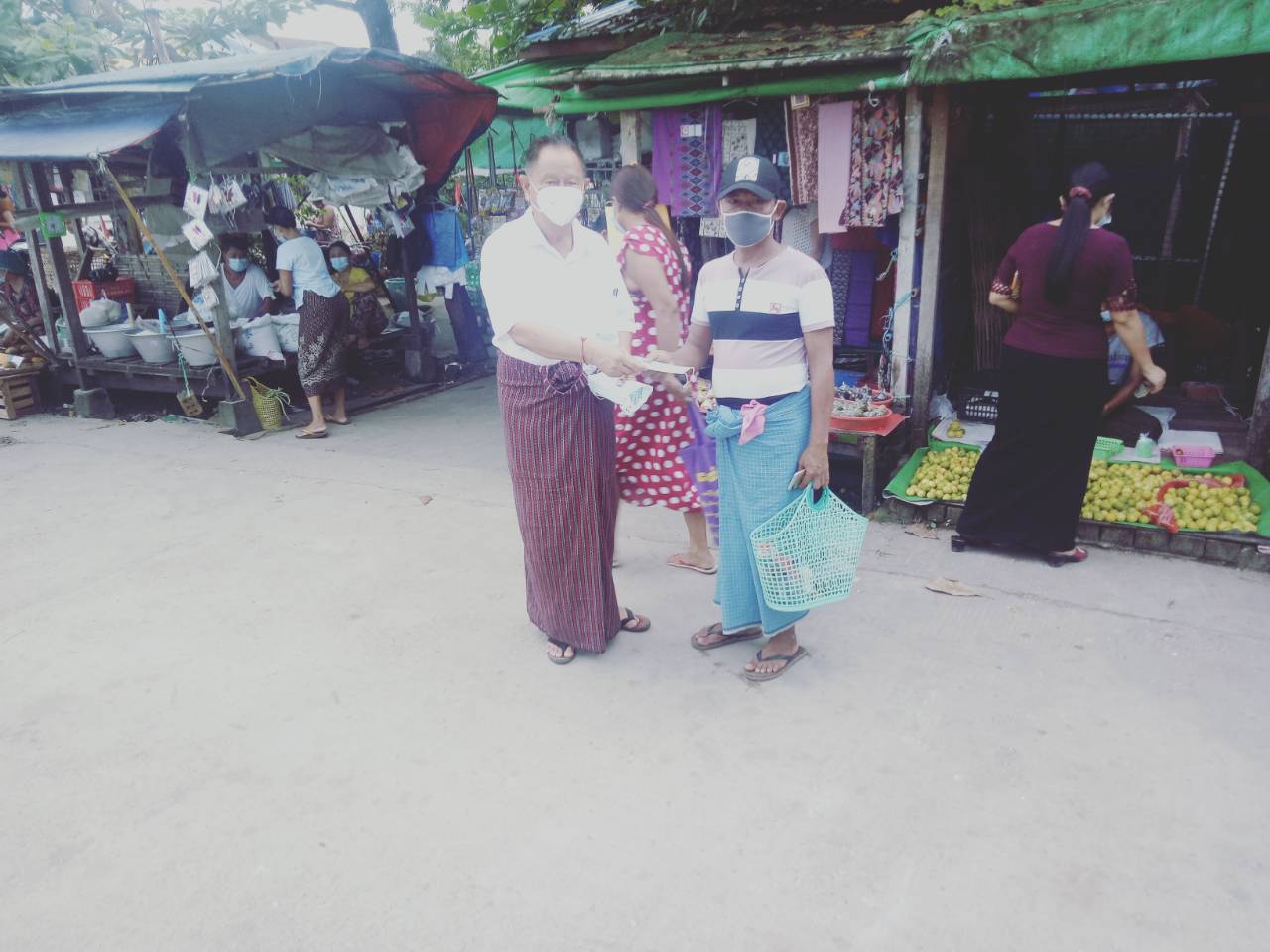 ထိုသို့ဖြန့်ဝေရာတွင် စျေးရောင်း စျေးဝယ်များအား နှာခေါင်းစည်း(Mask)များ စနစ်တကျ တပ်ဆင်ပြီးမှသာ ရောင်းချကြရန် အသိပညာပေးခြင်း၊ ပြည်သူများအနေဖြင့် မဖြစ်မနေ အပြင်ထွက်မည်ဆိုပါက နှာခေါင်းစည်း(mask)များတပ်ဆင်ပြီးမှသာ သွားလာကြရန်၊ နှာခေါင်းစည်း တပ်ဆင်ထားခြင်းမရှိသော စျေးရောင်း စျေးဝယ်များနှင့် ခရီးသွားမိဘ ပြည်သူ များအား နှာခေါင်းစည်း (Mask)များတပ်ဆင်ကြရန် အသိပညာပေး၍ အဆိုပါ နှာခေါင်းစည်း Mask များအား အမှတ်(၅)ရပ်ကွက် အုပ်ချုပ်ရေးမှူး ဦးသက်တင် ဦးဆောင်၍ အုပ်ချုပ်ရေးအဖွဲ့မှ အခမဲ့ ဖြန့်ဝေပေးခဲ့ပြီး ကိုဗစ်-၁၉ ရောဂါ တားဆီး၊ ကာကွယ်၊ ထိန်းချုပ်ရေး လုပ်ငန်းများ အတွက် အရှိန်အဟုန်မြှင့် ဆောင်ရွက်လျက်ရှိကြောင်း သိရသည်။