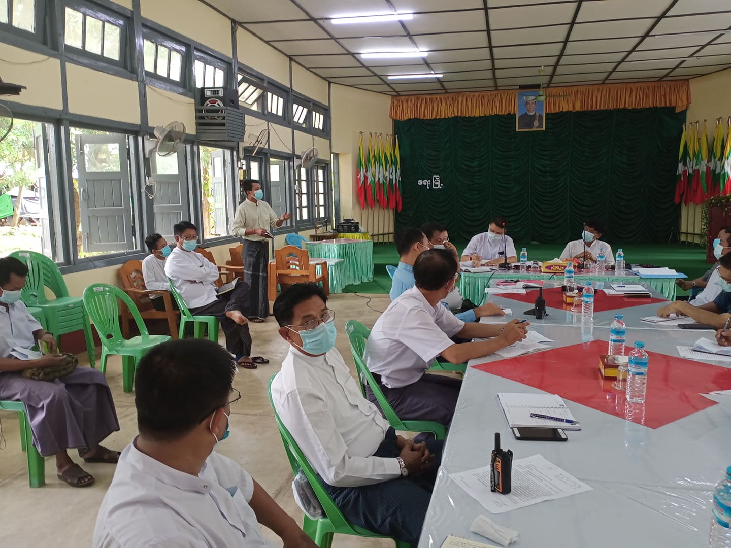 ရှေးဦးစွာ အမျိုးသားလွှတ်တော်ကိုယ်စားလှယ် ဦးမျိုးဝင်းက အဖွင့်အမှာစကားပြောကြားပြီး ကိုဗစ်-၁၉ ရောဂါ ကာကွယ်၊ ထိန်းချုပ်၊ ကုသရေး မြို့နယ်အဆင့် လုပ်ငန်းကော်မတီဥက္ကဌ၊ မြို့နယ် အုပ်ချုပ်ရေးမှူး ဦးကံဝင်းက ကိုဗစ်-၁၉ ရောဂါကြိုတင်ကာကွယ်ရေးလုပ်ငန်းစဉ်များနှင့် လုပ်ငန်း ဆောင်ရွက်ထားရှိမှုများကို ရှင်းလင်းပြောကြားပြီးနောက် မြို့နယ်ကျန်းမာရေးမှူး အဆင့်(၁) ဦးအောင်ဇော်ထိုက်က ကိုဗစ်-၁၉ ရောဂါပြန့်ပွါးနေမှုအကြောင်းများနှင့် ဌာန ဆိုင်ရာများ၊ လူမှုရေး အသင်းအဖွဲ့များမှ တာဝန်ရှိသူများနှင့် ရပ်ကွက်အုပ်ချုပ်ရေးမှူးများက မြို့နယ် အတွင်း ကိုဗစ်-၁၉ ရောဂါအတွက် ဆောင်ရွက်မည့်အစီအစဉ်များကို ဆွေးနွေး တင်ပြ ခဲ့ကြသည်။
