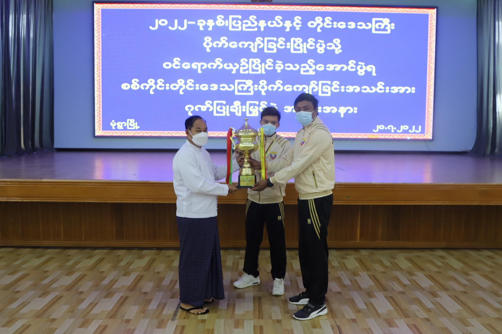 ဆက်လက်၍ တိုင်းဒေသကြီး လုံခြုံရေးနှင့် နယ်စပ်ရေးရာဝန်ကြီး ဗိုလ်မှူးကြီး ဝင်းတင်စိုးက အမျိုးသား တံခွန်စိုက်ဆုရ ပိုက်ကျော်ခြင်းအသင်းအား ဂုဏ်ပြုချီးမြင့်ငွေကျပ် သိန်း- ၃၀ အား လည်းကောင်း၊ တိုင်းဒေသကြီး လူမူရေးရာဝန်ကြီး ဦးအေးလိူင်က အမျိုးသား(၃)ယောက်တွဲ အဖွဲ့လိုက် ပထမဆုရ ပိုက်ကျော်ခြင်းအသင်းအား ဂုဏ်ပြုချီးမြင့်ငွေ ကျပ် - ၁၅ သိန်းအား လည်းကောင်း၊ တိုင်းဒေသကြီး သယံဇာတရေးရာဝန်ကြီး ဦးတင်သန်းဝင်းက အမျိုးသား(၂) ယောက်တွဲအဖွဲ့လိုက် ပထမဆုရ ပိုက်ကျော်ခြင်းအသင်းအား ဂုဏ်ပြုချီးမြှင့်ငွေကျပ် - ၁၅ သိန်းအားလည်းကောင်း၊ တိုင်းဒေသကြီး အားကစားနှင့် ကာယပညာဦးစီးဌာနမှ ညွှန်ကြားရေးမှူး ဦးကျော်မင်းသန်းက အမျိုးသားအသင်းလိုက် (၃)ယောက်တွဲ ဒုတိယဆုရ ပိုက်ကျော်ခြင်း အသင်းအား ဂုဏ်ပြုချီးမြင့်ငွေကျပ်-၁၀ သိန်း အားလည်းကောင်း အသင်းအုပ်ချုပ်သူနှင့် အားက စားသမားများထံ အသီးသီး ပေးအပ်ချီးမြှင့်ကြသည်။