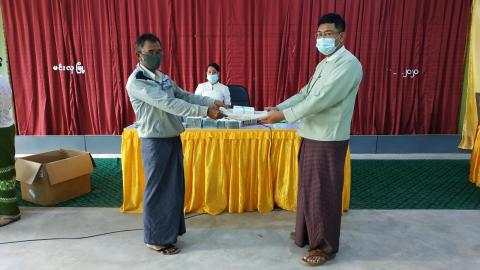 ရန်ကုန်တိုင်းဒေသကြီး၊ သင်္ဃန်းကျွန်းမြို့နယ် ကိုဗစ်-၁၉ ကာကွယ်ထိန်းချုပ်ရေးနှင့် အရေးပေါ် တုံ့ပြန်ရေးကော်မတီမှ မြို့နယ်စည်ပင်သာယာ ကော်မတီသို့ ပေးအပ်ခဲ့သော (mask) နှာခေါင်းစည်းများအား မြို့နယ်စည်ပင်သာယာရေး ကော်မတီ အတွင်းရေးမှူး ဦးနိုင်ဝင်းနှင့်