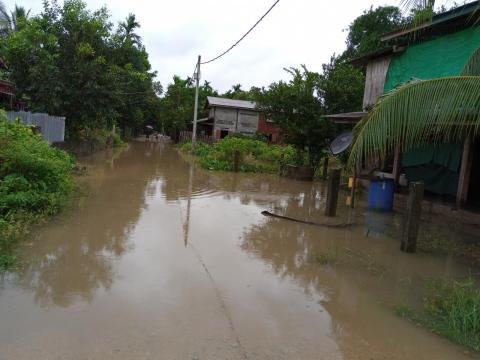 မိုးသည်းထန်စွာရွာသွန်းမှုကြောင့်ခမောက်ကြီးမြို့အမှတ်(၁)ရပ်ကွက်မြေနိမ့်ပိုင်းနှင့်ကော့သောင်း-ဘုတ်ပြင်းကားလမ်းမပေါ် ရေများဝင်ရောက်