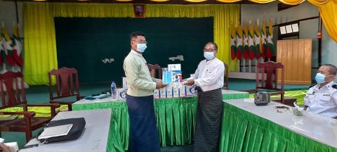ချောက်မြို့တွင် အထွေထွေအုပ်ချုပ်ရေးဦးစီးဌာနမှ Hand Held Mega Phone၊ အပူချိန်တိုင်းကိရိယာနှင့် နှာခေါင်းစည်း (Mask) များပေးအပ်