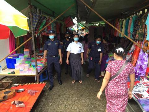 စမ်းချောင်းမြို့နယ် ယာယီပျံကျစျေးများအတွင်း ကိုဗစ်-၁၉ ရောဂါကူးစက်မှု မဖြစ်ပေါ်စေရန် နှာခေါင်းစည်း(mask)များ တပ်ဆင်ရေးအတွက် လိုက်လံစစ်ဆေး အသိပညာပေး နှိုးဆော်ခြင်းများ ဆောင်ရွက်