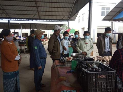 ရှမ်းပြည်နယ်(မြောက်ပိုင်း)၊ ကွတ်ခိုင်မြို့၊ ရေထွက်ဦးပန်းခြံအတွင်း ဖွင့်လှစ်ထားသည့် ယာယီပျံကျဈေးအတွင်း ကိုဗစ်-၁၉ ရောဂါ ကြိုတင် ကာကွယ် ထိန်းချုပ်နိုင်ရေးအတွက် တာဝန်ရှိသူများ ယနေ့ နံနက်ပိုင်းက သွားရောက် ကြည့်ရှု စစ်ဆေးသည်။