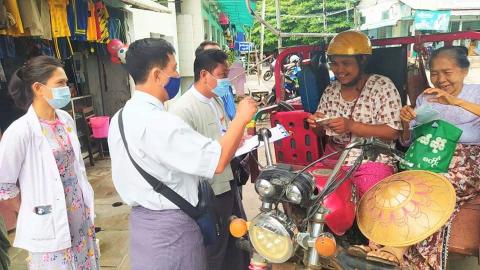 မကွေးတိုင်းဒေသကြီး သရက်မြို့၌ နေအိမ်ပြင်ပသွားလာရာတွင် နှာခေါင်းစည်း တပ်ဆင်ခြင်း မရှိသူများ အား ခုဝယ် ခုတပ်စနစ်ဖြင့် (Mask) တပ်ဆင်စေခြင်းများ ဆောင်ရွက်