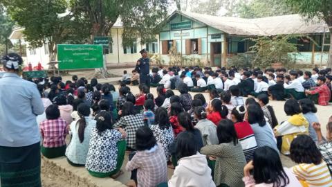 ရှမ်းပြည်နယ်(တောင်ပိုင်း) ရပ်စောက်မြို့၊ ဗထူးတပ်မြို့ရှိ တပ်မတော်(ကြည်း) ဗိုလ်သင်တန်းကျောင်း စစ်ရေးပြကွင်း၌ ယနေ့နံနက် ၇ နာရီခွဲအချိန်က ပြည်သူ့စစ်မှုထမ်းသင်တန်း အမှတ်စဉ် (၇/၂၀၂၄)ဆင်းပွဲပြုလုပ်ခဲ့ရာ ရှမ်းပြည်နယ်အစိုးရအဖွဲ့မှ လမ်းပန်းဆက်သွယ်ရေးဝန်ကြီး ဦးနေဝင်းအောင်၊ တပ်မတော်(ကြည်း)ဗိုလ်သင်တန်းကျောင်း ကျောင်းအုပ်ကြီး ဗိုလ်မှူးချုပ် နိုင်ဝင်းအောင်နှင့် တပ်မတော်အရာရှိများ၊ မြို့နယ်စီမံအုပ်ချုပ်ရေးအဖွဲ့ဝင်များ၊ မြို့နယ်အဆင့် ဌာနဆိုင်ရာ အကြီးအကဲများနှင့် ဝန်ထမ်းများ၊ ရပ်ကွက်/ကျေးရွာအုပ်စု အုပ်ချုပ်ရေးမှူးများ၊ ပြည်သူ့စစ်မှုထမ်း သင်တန်းသားများ တက်ရောက်ခဲ့ပြီး သင်တန်းဆင်းပွဲအခမ်းအနားတွင် တပ်မတော်(ကြည်း) ဗိုလ်သင်တန်းကျောင်း ကျောင်းအုပ်ကြီးက စံပြတပ်သားဆု၊ စစ်ရေးပြအကောင်းဆုံးဆု၊ လက်ဖြောင့်ထူးချွန်ဆု၊ စစ်မြေပြင်အင်ဂျင်နီယာထူးချွန်ဆု၊ ချေမှုန်းရေးအကောင်းဆုံးတပ်စိတ်ဆု၊ စစ်သည်တော်ကျင့်ဝတ်ဆု၊ တပ်စိတ်တိုက်ပွဲအကောင်းဆုံတပ်စိတ်ဆု၊ အိပ်ဆောင်ခင်းကျင်းမှုအကောင်းဆုံးဆု စသည်ဖြင့် ဆုများပေးအပ်ချီးမြှင့်ခဲ့ပြီး သင်တန်းသား (၆၃) ဦးအား သင်တန်းဆင်းမိန့်ခွန်း ပြောကြားခဲ့သည်။