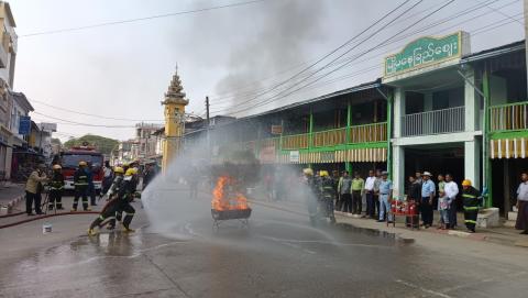 မြန်အောင် မြို့မနေခြည်ဈေး မီးဘေးန္တရာယ်ကြိုတင်ကာကွယ်ရေး သရုပ်ပြဇာတ်တိုက်လေ့ကျင့်