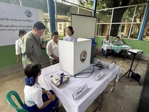 ဖားကန့်မြို့နယ် ရွေးကောက်ပွဲကော်မရှင်အဖွဲ့ခွဲအနေဖြင့် မဲရုံမှူး၊ ဒုမဲရုံမှူးနှင့် မဲရုံအဖွဲ့ဝင်များအား မြန်မာအီလက်ထရောနစ်မဲပေးစက် ကိုင်တွယ်အသုံးပြုနည်း သင်တန်…