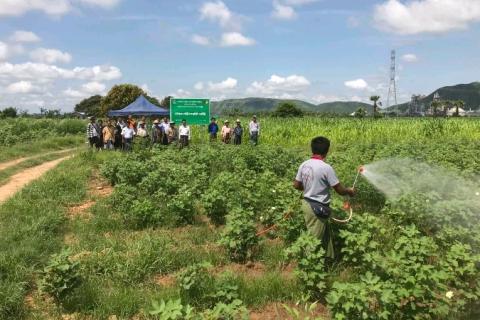 ကျောက်ဆည်မြို့နယ်တွင် လုပ်ငန်းခွင် တွင်ကျယ်ရေးနှင့် အချိန်ကုန်သက်သာစေရေး ဆေးဖျန်းစက်ဖြင့် ဝါစိုက်ခင်းများအား ဆေးဖြန်းခြင်းသရုပ်ပြ