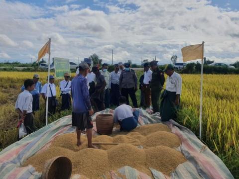 ပဲခူးတိုင်းဒေသကြီး၊ တောင်ငူခရိုင်၊ အုတ်တွင်းမြို့နယ် ဥယျာဉ်တော်ကျေးရွာအုပ်စု ကွင်းအမှတ် (၃၅၉)/ဦးပိုင်အမှတ်(၂၆) တောင်သူဦးညွန့်ဝေ၏မိုးစပါးမျိုးကွဲ GW-11 စံပြကွက်ခြွေလှေ့စက်ဖြင့် စံကွက်ရိတ်သိမ်းခြင်းကို ယနေ့နံနက်ပိုင်းက အဆိုပါစံပြကွက်၌ ပြုလုပ်သည်။