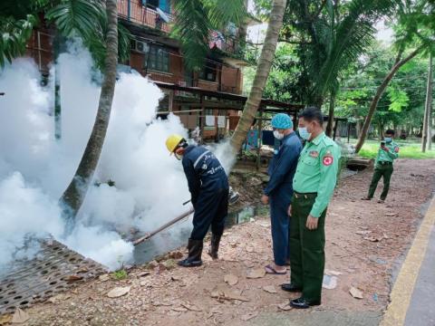 ရန်ကုန်တိုင်းဒေသကြီး၊ အနောက်ပိုင်းခရိုင်၊ လှိုင်မြို့နယ်၌ ခြင်မှတစ်ဆင့် ကူးစက်ရောဂါများဖြစ်ပွားမှုမှ ကာကွယ်နိုင်ရန်အတွက် သွေးလွန်တုပ်ကွေးရောဂါ ကြိုတင်ကာကွယ်နိုင်စေရန်နှင့် ဆင်ခြေထောက်ရောဂါ ဖြစ်ပွားမှုမရှိစေရန် ရည်ရွယ်၍ ကြိုတင်ကာကွယ်ရေးလုပ်ငန်းများ ဆောင်ရွက်လျက်ရှိရာ ယမန်နေ့တွင် လှိုင်မြို့နယ် အမှတ်(၁)စစ်ကြောရေးနှင့် တည်းခိုရိပ်သာအတွင်းရှိ ဆို က ရေး တီး ပြိုင်ပွဲဝင်များတည်းခိုမည့် အဆောင်နှင့် နေအိမ်လိုင်းခန်းများကို ခြင်ဆေးဖြန်းခြင်း၊ ရေစည်၊ရေကန်များတွင် အဘိတ်ဆေးခတ်ခြင်း၊ ဖုံး၊ သွန်၊ လဲ၊ စစ်နှင့် ပိုးလောက်လန်း ရှိ/မရှိ စစ်ဆေးခြင်း၊ ကလိုရင်းဆေးရည်ဖျန်းခြင်းများ ဆောင်ရွက်ခဲ့ကြောင်းသိရသည်။
