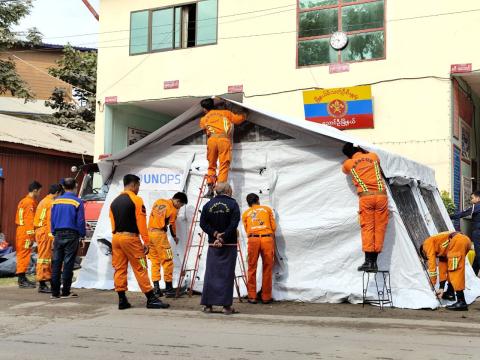 မန္တလေးတိုင်းဒေသကြီး ညောင်ဦးခရိုင် ညောင်ဦးမြို့နယ်၊ မီးသတ်ဦးစီးဌာန၊ မီးသတ်ဝန်ထမ်းများသည် အရေးပေါ်အခြေအနေများတွင် Alpinter Tent(ရွက်ဖျင်တဲ)ကျွမ်းကျင်စွာ တည်ဆောက်နိုင်ရန် ဖေဖော်ဝါရီ ၂ ရက် နံနက် ၁၀ နာရီက မြို့နယ်မီးသတ်ဦးစီးမှူး ရုံးရှေ့တွင် လက်တွေ့ဆောင်ရွက်သည်။
