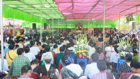 ကရင်ပြည်နယ် လှိုင်းဘွဲမြို့နယ် ရေပူကြီးကျေးရွာ၌ ရာဇသုခအောင်ချမ်းသာစေတီ ထီးတော်တင်လှူခြင်းအခမ်းအနားကို ယနေ့ နံနက်ပိုင်းက ကျင်းပသည်။