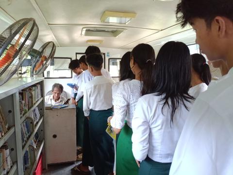 ကော့မှူးမြို့နယ်တွင် ရွေ့လျားစာကြည့်တိုက်ယာဉ်ဖြင့် ဌာနဆိုင်ရာရုံးများ၊ အခြေခံပညာကျောင်းများအရောက် စာအုပ်စာစောင်များ လိုက်လံငှားရမ်းပေး