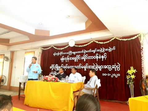 ရှမ်းပြည်နယ်(အရှေ့ပိုင်း)၊ မိုင်းခတ်မြို့နယ်တွင် ရပ်ကွက်၊ကျေးရွာအုပ်စု အုပ်ချုပ်ရေးမှူး ရွေးချယ်ခြင်းဆိုင်ရာ ဥပဒေ၊ နည်းဥပဒေများအား ရှင်းလင်းဆွေးနွေးခြင်းကို ယမန်နေ့မွန်းလွဲ (၁)နာရီအချိန် က အထွေထွေအုပ်ချုပ်ရေးဦးစီးဌာန အစည်းအဝေးခန်းမ၌ ပြုလုပ်ခဲ့သည်။