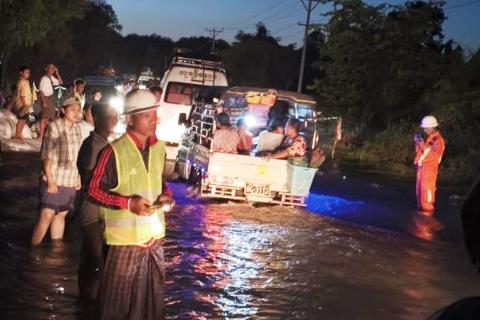 မန္တလေးတိုင်းဒေသကြီး၊ ကျောက်ပန်းတောင်းမြို့နယ် ကြက်မောက်တောင်ရေလှောင်တမံ၏ ရေပိုလွှဲမှ ရေကျော်စီးဆင်းမှုကြောင့် ကျောက်ပန်းတောင်း-မိတ္ထီလာသွား ကမ်းလမ်းတွင် ရေကျော်မှုဖြစ်ပွားခဲ့ပြီး အဆိုပါ ရေစီးဆင်းမှု အရှိန်ကြောင့် ကိုင်းကျေးရွားအနီး မိုင်တိုင်အမှတ် ၅၁/၄ မှ မိုင်တိုင်အမှတ် ၅၁/၇ အတွင်းရှိ တံတားအမှတ် ၅/၅၂ မှာ အောက်တိုဘာ (၃)ရက်နေ့ နံနက်(၁၀:၄၅)နာရီက ကျိုးကျမှု ဖြစ်ပွားကာ မော်တော်ယာဉ်များ ဖြတ်သန်းသွားလာမရတော့သဖြင့် ယာယီလမ်း ပိတ်ဆို့ကာ ကျောက်ဖြည့် ပြုပြင်မှုများကို လမ်းဦးစီးဌာန ခရိုင်နှင့် မြို့နယ်တာဝန်ရှိသူ များက သက်ဆိုင်ရာဌာနများနှင့် ပူးပေါင်း၍ မွန်းလွဲ(၁:၁၅)နာရီမှစကာ အစောတလျင် ဆောင်ရွက်ခဲ့ကြရာ၊ ညနေ(၆:၂၀)နာရီတွင် မော်တော်ယာဉ်ကြီး/ယာဉ် ငယ်များ ပြန်လည် ဖြတ်သန်းသွားလာနိုင်ပြီဖြစ်ကြောင်း သိရသည်။