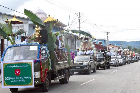 ရှမ်းပြည်နယ်(အရှေ့ပိုင်း)၊ မိုင်းဆတ်မြို့နယ်လုံးဆိုင်ရာ (၅၅)ကြိမ်မြောက် နယ်မြေခံတပ်ရင်း၊ တပ်ဖွဲ့များ၊ ခရိုင်/မြို့နယ် ဌာနဆိုင်ရာများနှင့် ဒေသခံပြည်သူများ၏ စုပေါင်းမဟာဘုံကထိန် ပဒေသာပင်များအား မြတ်ဗုဒ္ဓရုပ်ပွားတော်နှင့်အတူ ယမန်နေ့က မော်တော်ယာဉ်များဖြင့် မြို့ပတ်လမ်းအတိုင်းလှည့်လည် ပူဇော်ခဲ့ပြီး ယနေ့နံနက် ၉ နာရီခွဲက ကထိန်လျာသင်္ကန်းနှင့် ပဒေသာပင်များ ဆက်ကပ်လှူဒါန်းခြင်း အခမ်းအနားကို တပ်နယ်ရှိ ရန်ကြီးအောင်ခန်းမတွင် ကျင်းပသည်။