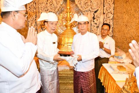 ပြည်မြို့ လေးဆူဓာတ်ပျော်ရွှေဆံတော်စေတီတော်မြတ်ကြီး ရင်ပြင်တော်မြတ်စွယ်တော်တိုက်ရှိ ဗုဒ္ဓမြတ်စွယ်တော် (၁၂၆)နှစ်ပြည့် ဖွင့်လှစ်အပူဇော်ခံပွဲ ဖွင့်ပွဲအခမ်းအနားကို ယမန်နေ့ ညနေ ၄ နာရီခွဲက စေတီတော်ရင်ပြင်ကျားပျံဓမ္မာရုံ၌ကျင်းပရာ ပဲခူးတိုင်းဒေသကြီးအစိုးရအဖွဲ့ဝန်ကြီးချုပ် ဦးမျိုးဆွေဝင်းနှင့် ဇနီးဒေါ်စိုးစိုးသက်တို့ တက်ရောက်ကြည်ညို ကုသိုလ်ကောင်းမှုများ ပြုလုပ်သည်။