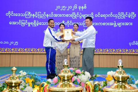 ၂၀၂၅ ခုနှစ်၊ တိုင်းဒေသကြီးနှင့်ပြည်နယ်အားကစားပြိုင်ပွဲသို့ ဝင်ရောက်ယှဉ်ပြိုင်ခဲ့ပြီး အောင်မြင်မှုရရှိခဲ့သော ဧရာဝတီတိုင်းဒေသကြီးအားကစားအဖွဲ့များအား ဂုဏ်ပြုချီးမြှင့်ခြင်းအခမ်းအနားကို ယမန်နေ့နံနက်ပိုင်းက ပုသိမ်မြို့၊ မြို့တော်ခန်းမတွင်ပြုလုပ်ခဲ့ရာ ဧရာဝတီတိုင်းဒေသကြီး ဝန်ကြီးချုပ်ဦးတင်မောင်ဝင်းသည် တာဝန်ရှိသူများနှင့်အတူ တက်ရောက်၍ ဆုများချီးမြှင့်ခဲ့သည်။