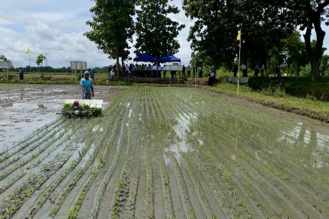 ပဲခူးတိုင်းဒေသကြီးဝန်ကြီးချုပ်နှင့် အဖွဲ့ နတ်တလင်းမြို့၌ လက်ဆွဲကောက်စိုက်စက်ဖြင့် စိုက်ပျိုးနေမှုအား ကြည့်ရှုစစ်ဆေး