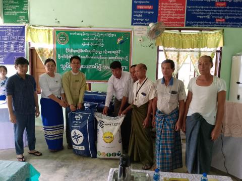 လှည်းကူးမြို့နယ်၊ သနပ်ပြင်ကျေးရွာ၌ နိုင်ငံ့စီးပွားမြှင့်တင်ရေးရန်ပုံငွေဖြင့် မိုးစပါးစိုက်ပျိုးမည့် သမဝါယမအသင်းသား တောင်သူများအား သွင်းအားစုများ ပေးအပ်