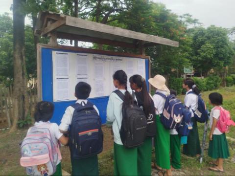 ကျိုင်းတောင်းမြို့ ပြန်ကြားရေးနှင့်ပြည်သူ့ဆက်ဆံရေးဦးစီးဌာန မြေစိုက်နံရံကပ်ပြဘုတ်တွင် ကလေးအလုပ်သမားနှင့်ပတ်သတ်သည့် အကြောင်းအရာများအားပြသ