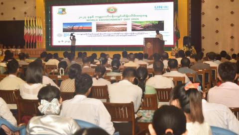 ရန်ကုန်တိုင်းဒေသကြီး၌ ၂၀၂၄ ခုနှစ်၊ ကမ္ဘာ့ပတ်ဝန်းကျင်ထိန်းသိမ်းရေးနေ့ အထိမ်းအမှတ် အခမ်းအနားကို (သဲကန္တာရတိုက်ဖျက်ရေးနှင့် မိုးခေါင်ရေရှားဒဏ်ခံနိုင်ရေး မြေယာပြန်လည် ပြုပြင်ပေး)" ဆောင်ပုဒ်ဖြင့် ယမန်နေ့ နံနက် ၉ နာရီတွင် ရန်ကုန်တိုင်းဒေသကြီး အစိုးရအဖွဲ့ရုံး၊ မင်္ဂလာခန်းမ၌ ကျင်းပရာ ရန်ကုန်တိုင်းဒေသကြီးအစိုးရအဖွဲ့ ဝန်ကြီးချုပ် ဦးစိုးသိန်း တက်ရောက် အဖွင့်အမှာစကားပြောကြားသည်။