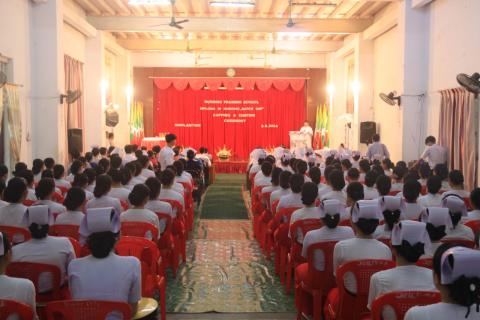 မွန်ပြည်နယ် သူနာပြုသင်တန်းကျောင်း (မော်လမြိုင်) ၏ အမျိူးသားကုတ်အင်္ကျီ/သူနာပြု ဦးဆောင်းအပ်နှင်းပွဲနှင့် ဆုချီးမြှင့်ပွဲ အခမ်းအနားကို ယမန်နေ့ မွန်းလွဲပိုင်းက မော်လမြိုင်မြို့၊ သူနာပြုသင်တန်းကျောင်း (မော်လမြိုင်)၊ သင်တန်းခန်းမဆောင်၌ ကျင်းပပြုလုပ်ရာ
