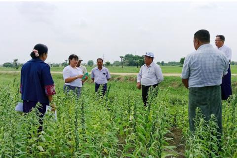 ဘောင်ကြီးတင်စနစ်ဖြင့် တစ်ကွင်းတစ်စပ်တည်း စိုက်ပျိုးထားသော ဧက ၂၀၀ နွေနှမ်းစိုက်ခင်းများ အောင်မြင်ဖြစ်ထွန်းနေမှုအခြေအနေအား တာဝန်ရှိသူများ ကွင်းဆင်းစစ်ဆေး