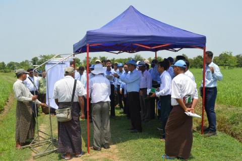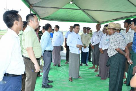 ဧရာဝတီတိုင်းဒေသကြီး၊ ပုသိမ်မြို့နယ်၊ ဘုရားကြီးကုန်းကျေးရွာရှိ တောင်သူ ဦးအောင်ကျော်ခိုင်၏ လယ်မြေတွင် စက်မှုလယ်ယာဦးစီးဌာန၏ နည်းပညာအကူအညီဖြင့် ပုသိမ်စက်မှုဇုန်မှ ထုတ်လုပ်သော လက်ဆွဲကောက်စိုက်စက် စမ်းသပ်သရုပ်ပြစိုက်ပျိုးခြင်း အခမ်းအနားကို ယမန်နေ့နံနက်ပိုင်းတွင် ပြုလုပ်ခဲ့ရာ တိုင်းဒေသကြီးဝန်ကြီးချုပ် ဦးတင်မောင်ဝင်းသည် တာဝန်ရှိသူများနှင့်အတူ သွားရောက်ကြည့်ရှု အားပေးခဲ့သည်။