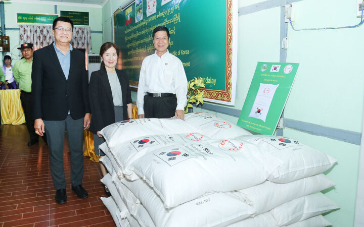 The hand over ceremony of 1,620 tonnes of rice donated by the Republic of Korea under the ASEAN Plus Three Emergency Rice Reserve-APTERR Programme-3 (2025) to suport the earthquake-affected people from Mandalay Region through the Department of Agriculture took place at the regional Agriculture Department in Chanmyathazi Township yesterday morning.