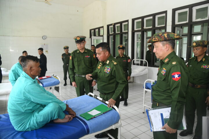 Commander-in-Chief of Defence Services General Ye Win Oo, accompanied by his wife Daw Nilar, senior Tatmadaw officers from the Office of the Commander-in-Chief and their wives, the commander of Triangle Region Command and officials, yesterday morning gave words of encouragement to officers, other ranks, members of the Myanmar Police Force and people’s military (local) members receiving medical treatment at the local Tatmadaw hospital in Mongphyat.
